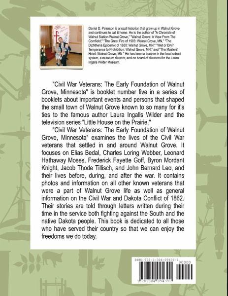 "Civil War Veterans: The Early Foundation of Walnut Grove, Minnesota," examines the lives of Civil War and Dakota Conflict veterans Elias Bedal,Charle Loring Webber,Byron Mordant Knight, Frederick Fayette Goff, Jacob Thode Tillisch, Leonard Hathaway Moses, and John Bernard Leo, before, during, and after their service in the military. This is done through letters written during the time and other sources. It also lists all other known veterans to play a part in the growing of Walnut Grove with photos and service information. The booklet also include general information on both the Civil War and the Dakota Conflict of 1862. 74 pages.