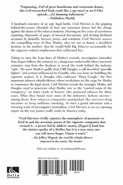 A landmark narrative of an epic legal battle, Civil Warriors is the gripping behind-the-scenes account of how one tenacious lawyer led the charge against the titans of the tobacco industry. Drawing on five years of eyewitness reporting, thousands of pages of internal documents, and riveting firsthand stories of plaintiffs, lawyers, jurors, and scientists, Civil Warriors weaves the compelling story of attorney Ron Motley, who, along with other die-hard lawyers, scientists, and tobacco-busters, fought tirelessly to bring the tobacco industry to justice. Taking us onto the front lines of Motley's crusade, investigative journalist Dan Zegart follows the attorney to a dangerous underworld where maverick scientists and corporate whistle-blowers step from the shadows to reveal the truth behind the industry "spin.” We meet the unforgettable cast of characters that draw Motley on toward his goals ... the mysterious ex-Reynolds employee known as "Deep Cough,” who told where evidence on nicotine-laced tobacco was hidden ... the researchers who proved the addictive nature of nicotine — and were advised by the FBI to check their cars for bombs every morning. And we witness how Ron Motley led his quest for truth, justice, and hundred-billion-dollar awards ... to penetrate, finally, the "control room of the conspiracy,” an inner circle of lawyers who protected tobacco for thirty years. Civil Warriors is at once a grand adventure and a towering work of investigative journalism — an eye-opening report on the way justice really works in America today.