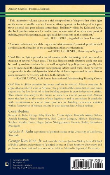 List of Figures and Tables Preface PART I: BACKGROUND Introduction: Mapping the Civil War Landscape in Africa Kelechi A. Kalu and George Klay Kieh, Jr. Chapter 1: Theories and Explanations of Civil Conflicts and Wars in Africa Kelechi A. Kalu PART II: CASE STUDIES Chapter 2: Burundi: A Continuum of Civil Wars and Violence Dawn Nager Chapter 3: Civil War in Cameroon Avitus Agbor Chapter 4: Post-Traumatic Stress Disorder and Conflict: A Study of the Tuobodom Chieftaincy Conflict in Ghana Sabina Appiah-Boateng, Stephen B. Kendie, and Kenneth Aikins Chapter 5: Liberia's Civil Wars George Klay Kieh, Jr. Chapter 6: Personality Conflicts and the Nigerian Civil War Michael Ediagbonya Chapter 7: On Rwanda's Civil War (October 1, 1990-April 6, 1994): Assessing the International Determinant Fiacre Bienvenu Chapter 8: The Sierra Leone Civil War: An Examination of Internal, Regional, and External Causes Earl Conteh-Morgan Chapter 9: The South Sudanese Civil War Francis Onditi Chapter 10: The C