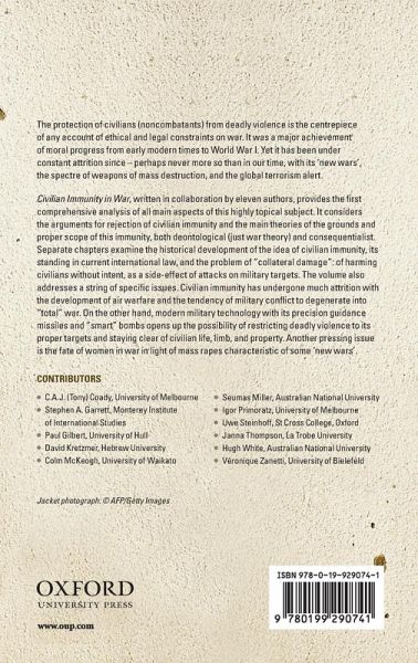 The protection of noncombatants from deadly violence is the centrepiece of any account of ethical and legal constraints on war. It was a major achievement of moral progress from early modern times to World War I. Yet it has been under constant attrition since - perhaps never more so than in our time, with its 'new wars', the spectre of weapons of mass destruction, and the global terrorism alert. Civilian Immunity in War, written in collaboration by eleven authors, provides the first comprehensive analysis of all main aspects of this highly topical subject. It considers the arguments for rejection of civilian immunity and the main theories of the grounds and proper scope of this immunity, both deontological (just war theory) and consequentialist. Separate chapters examine the historical development of the idea of civilian immunity, its standing in current international law, and the problem of "collateral damage": of harming civilians without intent, as a side-effect of attacks on military targets. The volume also addresses a string of specific issues. Civilian immunity has undergone much attrition with the development of air warfare and the tendency of military conflict to degenerate into "total" war. On the other hand, modern military technology with its precision guidance missiles and "smart" bombs opens up the possibility of restricting deadly violence to its proper targets and staying clear of civilian life, limb, and property. Another pressing issue is the fate of women in war in light of mass rapes characteristic of some 'new wars'.