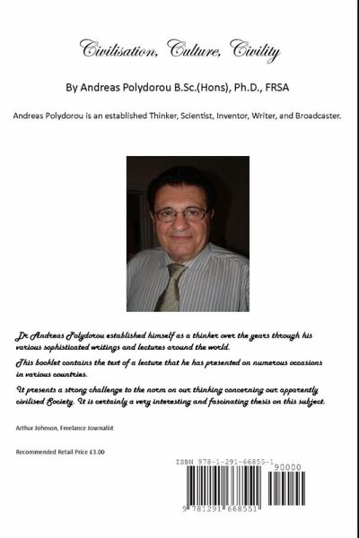 An exposé of present day Society and a comparison with ancient civilisations. Dr Andreas Polydorou established himself as a thinker over the years through his various sophisticated writings and lectures around the world. This booklet contains the text of a lecture that he has presented on numerous occasions in various countries. It presents a strong challenge to the norm on our thinking concerning our apparently civilised Society. It is certainly a very interesting and fascinating thesis on this subject. Arthur Johnson, Freelance Journalist