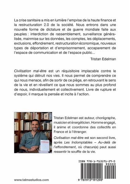 La crise sanitaire a mis en lumière l'emprise de la haute finance et la restructuration 2.0 de la société. Nous entrons dans une nouvelle forme de dictature et de guerre mondiale faite aux peuples : interdiction de rassemblement, surveillance généralisée, mainmise sur les données, les comptes, les déplacements, exclusions, effondrement, restructuration économique, nouveaux types de déportation et d'emprisonnement, accaparement de l'espace de communication et de l'espace public... Tristan Edelman Civilisation mal-être est un réquisitoire implacable contre le système capitaliste qui détruit nos vies. Il nous permet de comprendre ce qui nous menace, afin de sortir de ce piège, en retrouvant le sens de la vie et en réveillant ce que nous sommes au plus profond de nous, individuellement et collectivement. Livre de rupture et d'espoir, il marque la pensée et incite à l'action.