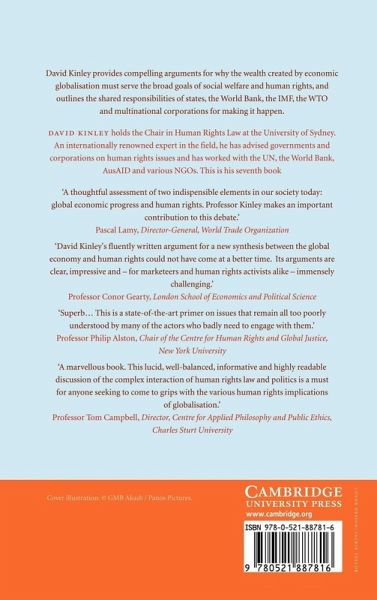 Economic globalisation and universal human rights both have the aspiration and power to improve and enrich individuals and communities. However, their respective institutions, methods, practices and goals differ, leading to both detrimental clashes and beneficial synergies. In this book, David Kinley analyses how human rights intersect with the trade, aid and commercial dimensions of global economic relations, taking the view that, while the global economy is a vitally important civilising instrument, it itself requires civilising according to human rights standards. Combining meticulous research with highly informed views and experiences, he outlines the intellectual, policy and practical frameworks for ensuring that the global economy advances the ends of human rights, argues for better exploitation of the global economy's capacity to distribute as well as create wealth, and proposes mechanisms by which to minimise and manage the socially debilitating effects of its market failures and financial meltdowns.