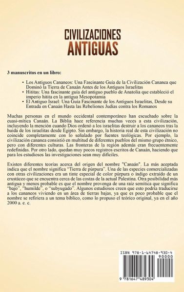 3 manuscritos completos en 1 libroLos Antiguos Cananeos: Una Fascinante Guía de la Civilización Cananea que Dominó la Tierra de Canaán Antes de los Antiguos Israelitas Hititas: Una fascinante guía del antiguo pueblo de Anatolia que estableció el imperio hitita en la antigua Mesopotamia El Antiguo Israel: Una Guía Fascinante de los Antiguos Israelitas, Desde su Entrada en Canaán Hasta las Rebeliones Judías contra los Romanos La primera parte de este libro incluye:Hallazgos Revolucionarios Proporcionados por Modernas Técnicas de Detección Arqueológica Una Explicación Simple sobre Qué es Canaán y Dónde se Encuentra Fascinantes Descubrimientos de Artefactos Cananeos Notables Conocimientos sobre su Gobierno y Estructura Social Sorprendentes Teorías a cerca del Colapso de la Edad de Bronce Lo que hay que Saber sobre la Cultura de los Cananeos El Conflicto Principal con Canaán que Ocurre Tempranamente en la Biblia y Más Impactantes Menciones en la Biblia Religión y Creencias ¡Y mucho, mucho más! Al leer la segunda parte de este libro, usted:El origen de los hititas en la Edad de Bronce La formación del Viejo Reino, 1700 - 1500 a. C. El Reino Nuevo, 1400 - 1200 a. C. La caída de los hititas Los reinos siro-hitita o neo-hitita El arte, el simbolismo y el papel de los hititas en la Biblia La vida legal y cotidiana de los hititas La vida legal y cotidiana de los hititas La vida legal y cotidiana de los hititas Tercera parte de este libro, usted:Cultura y Sociedad a través de los Años La Edad del Bronce Tardía y la Edad de Hierro Temprana La Edad de Hierro Tardía Los Israelitas bajo Babilonia El Control de los Persas El Período Helenístico y Judea Bajo los Seléucidas La Dinastía Asmonea Temprana La Expansión Asmonea y la Guerra Civil Gobierno Romano de Judea La Antigua Religión Hebrea y el Judaísmo ¡Y mucho, muchísimo más! ¡Obtenga este libro ya para aprender más sobre Civilizaciones antiguas!