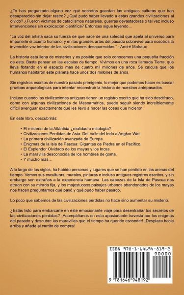 ¿Te has preguntado alguna vez qué secretos guardan las antiguas culturas que han desaparecido sin dejar rastro? ¿Qué pudo haber llevado a estas grandes civilizaciones al olvido? ¿Fueron víctimas de cataclismos naturales, guerras devastadoras o tal vez incluso intervenciones sin explicación científica? Entonces sigue leyendo... "La voz del artista saca su fuerza de que nace de una soledad que apela al universo para imponerle el acento humano, y en las grandes artes del pasado sobrevive para nosotros la invencible voz interior de las civilizaciones desaparecidas." - André Malraux La historia está llena de misterios y es posible que solo conocemos una pequeña fracción de esta. Basta pensar en las escalas de tiempo. Vivimos en una roca llamada Tierra, que lleva flotando en el espacio más de cuatro mil millones de años. Se calcula que los humanos habitaron este planeta hace unos dos millones de años. Sin registros escritos de nuestro pasado primigenio, lo mejor que podemos hacer es buscar pruebas arqueológicas para intentar reconstruir la historia de nuestros antepasados. Incluso cuando las civilizaciones antiguas tienen un registro escrito que ha sido descifrado, como con algunas civilizaciones de Mesoamérica, puede seguir siendo increíblemente difícil averiguar exactamente qué les llevó a hacer las cosas que hicieron. En este libro, descubrirás: El misterio de la Atlántida ¿realidad o mitología? Civilizaciones Perdidas de Asia: Del Valle del Indo a Angkor Wat. La primera civilización avanzada de Europa. Enigmas de la Isla de Pascua: Gigantes de Piedra en el Pacífico. El Esplendor Olvidado de los mayas y los Incas. La maravilla desconocida de los hombres de goma. Y mucho más... A lo largo de los siglos, ha habido personas y lugares que se han perdido en las arenas del tiempo. Vemos sus esculturas, murales, pinturas e incluso antiguos registros escritos, y sin embargo son extraños a la experiencia humana. Las cabezas de la Isla de Pascua nos atraen con su mirada fija, y los majestuosos paisajes urbanos abandonados de los mayas nos hacen preguntarnos qué pasó y qué pudo haber pasado. Lo poco que sabemos de las civilizaciones perdidas no hace sino aumentar su misterio. ¿Estás listo para embarcarte en este emocionante viaje para desentrañar los secretos de las civilizaciones perdidas? ¡Acompáñanos en esta apasionante travesía por los enigmas del pasado y descubre las maravillas que el tiempo ha querido esconder! ¡Desplaza hacia arriba y añade al carrito de compra!