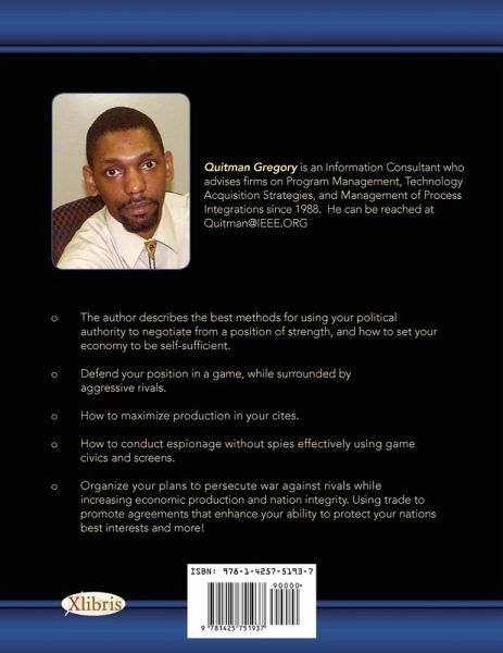 The author describes the best methods for using your political authority to negotiate from a position of strength, and how to set your economy to be self-sufficient. The book discusses the following. How to defend your position in a game, while surrounded by aggressive rivals. How to maximize production in your cites. How to conduct espionage without spies effectively using game civics and screens. How to organize your plans to persecute war against rivals while increasing economic production and nation integrity. How to use trade to promote agreements that enhance your ability to protect your nations best interests and more! For ages 13 and above.
