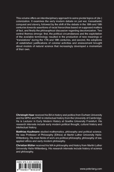 This volume offers an interdisciplinary approach to some pivotal topics of (de-) colonization. It examines the early modern debate on just war, transatlantic conquest and slavery, followed by the shift of the debate in the 18th and 19th centuries towards assertions of racial hierarchies based on supposed matters of fact, and finally the philosophical discussion regarding decolonization. Two central themes emerge: first, the political circumstances and the exploitation of the available terminology resulted in the production of new meanings or "translations" during the 17th and 18th centuries, and second, the adoptions of established justifications of colonial activities and enslavement brought about models of natural science that increasingly developed a momentum of their own.