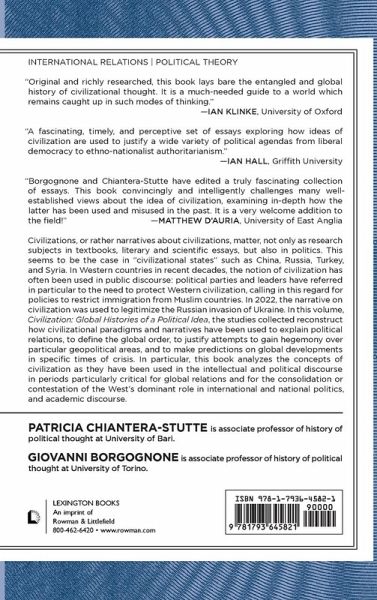 Introduction: Assembling the Civilizational Jigsaw by Giovanni Borgognone and Patricia Chiantera-Stutte Chapter 1: Challenges to the West: Civilizational Theory, Imperialism, and Liberal Internationalism by Patricia Chiantera-Stutte Chapter 2: An Historian's Approach to Civilization: Arnold J. Toynbee and the Study of International Affairs in the Twentieth Century by Luca G. Castellin Chapter 3: Governable Masses and Manageable Democracy: Samuel Huntington and the Origins of the Clash of Civilizations Theory by Giovanni Borgognone Chapter 4: The 'Western' Roots of Democracy: A Geopolitical Dilemma by Paulo Butti de Lima Chapter 5:Pan-Islamism and Pan-Arabism: Debating Possible Convergences in Responses to Modernity by Marco Di Donato Chapter 6: From Pan-Asianism to an Afro-Asian Solidarity: Notions and Connotations of Civilization in the Context of Chinese Revolution, 1900-1966 by Zhiguang Yin Chapter 7: Civilizationism in Russia from the Slavophiles to Vladimir Putin by Kåre Johan Mjør Conclusion: A