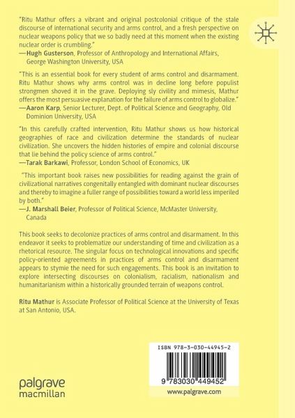 This book seeks to decolonize practices of arms control and disarmament. In this endeavor it seeks to problematize our understanding of time and civilization as rhetorical resources. The need for such an undertaking can be premised on the claim that while problems of modernity, ethnocentrism and universalism are now a central concern within the field of international relations, these ideas are scarcely debated or contested within the field of arms control and disarmament. The singular focus on technological innovations and specific policy-oriented agreements in practices of arms control and disarmament appears to stymie the need for such engagements. This book is an invitation to explore intersecting discourses on colonialism, racialism, nationalism and humanitarianism within a historically grounded terrain of weapons control. An understanding of these practices is vital not to prescribe any standards of civilization or exceptionalism in weapons control but to be cognizant throughcritique of the dangers embedded in any effort at reconstellating the constitutional nuclear order.