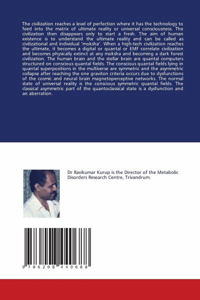 The civilization reaches a level of perfection where it has the technology to feed into the matrix of ultimate reality or universal consciousness. The civilization then disappears only to start a fresh. The aim of human existence is to understand the ultimate reality and can be called as civilizational and individual 'moksha'. When a high-tech civilization reaches the ultimate, it becomes a digital or quantal or EMF correlate civilization and becomes physically extinct at any moksha and becoming a dark forest civilization. The human brain and the stellar brain are quantal computers structured on conscious quantal fields. The conscious quantal fields lying in quantal superpositions in the multiverse are symmetric and the asymmetric collapse after reaching the one graviton criteria occurs due to dysfunctions of the cosmic and neural brain magnetoperceptive networks. The normal state of universal reality is the conscious symmetric quantal fields. The classical asymmetric part of thequantoclassical state is a dysfunction and an aberration.