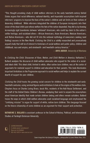 In Civilizing the Child: Discourses of Race, Nation, and Child Welfare in America, Katherine S. Bullard analyzes the discourse of child welfare advocates who argued for the notion of a racialized ideal child. This ideal child, limited to white, often native-born children, was at the center of arguments for material support to children and education for their parents. This book illuminates important limitations in the Progressive approach to social welfare and helps to explain the current dearth of support for poor children. Civilizing the Child tracks the growing social concern with children in the nineteenth and early-twentieth centuries. The author uses seminal figures and institutions to look at the origins of the welfare state. Chapters focus on Charles Loring Brace, Jacob Riis, residents of the Hull House Settlement, and the staff of U.S. Children's Bureau, analyzing their work to unpack the assumptions about American identity that made certain children belong and others remain outsiders. Bullard traces the ways in which child welfare advocates used racialized language and emphasized the "civilizing mission" to argue for support of white native-born children. This language focused on the future citizenship of some children as an argument for their support and protection.