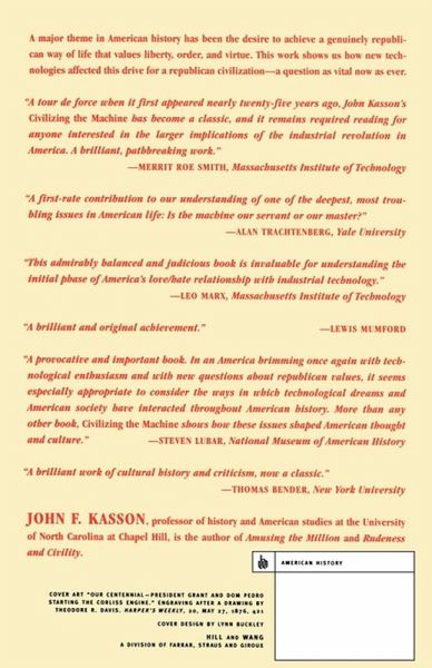 In Civilizing the Machine, John F. Kasson asks how new technologies have affected this drive for a republican civilization-and the question is as vital now as ever. A major theme of American history has always been the desire to achieve a genuinely republican way of life that values liberty, order, and virtue. Civilizing the Machine was an innovative and compelling work when it first appeared two decades ago: Kasson's analysis of the technical developments in transportation, communication, and manufacture from the Revolution to the of the nineteenth century showed how technologies were dealt with in sources as diverse as the debates of Hamilton and Jefferson; the factories of Lowell, Massachusetts; the writings of Ralph Waldo Emerson; the prints of Currier & Ives; and the utopian and dystopian novels of Howells and Twain. Kasson's profound, wide-ranging inquiry into this central issue in American history is now available again with a new Introduction by the author.