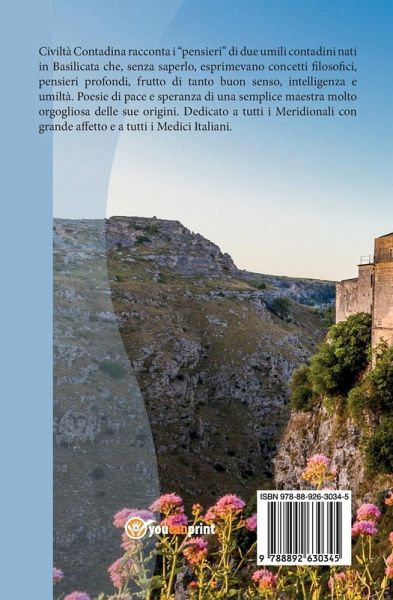 Civiltà Contadina racconta i "pensieri" di due umili contadini nati in Basilicata che, senza saperlo, esprimevano concetti filosofici, pensieri profondi, frutto di tanto buon senso, intelligenza e umiltà. Poesie di pace e speranza di una semplice maestra molto orgogliosa delle sue origini. Dedicato a tutti i Meridionali con grande affetto e a tutti i Medici Italiani.