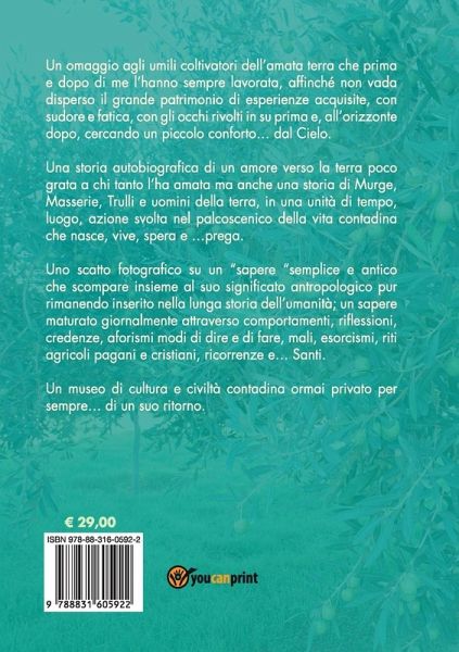 Un omaggio agli umili coltivatori dell'amara terra che prima di me, e pure dopo, l'hanno lavorata affinché non vada disperso il patrimonio di esperienze acquisite con il sudore della fronte e gli occhi rivolti al Cielo, e pure all'orizzonte. Storia autobiografica di un amore verso la terra a volte ingrata; una fotografia di un sapere semplice e antico che sta scomparendo insieme al suo passato antropologico, storia dell'umanità. Storia di Murge e Masserie, Trulli e uomini della terra in una unità di tempo, luogo e azione nel teatro della vita contadina che nasce, vive e muore, difficile percorso di esperienze e riflessioni maturate fra Santi, aforismi, credo, modi di dire e fare, comportamenti, ricorrenze, riti agricoli, pagani e cristiani, mali ed esorcismi. Museo di cultura e civiltà contadina, prima del futuro appena passato, ormai privato del suo ritorno, per sempre.