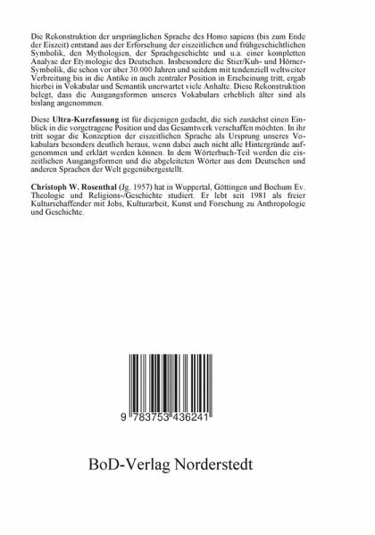 Die Rekonstruktion der eiszeitlichen Sprache des Homo sapiens entstand aus der Erforschung der eiszeitlichen und frühgeschichtlichen Symbolik, den Mythologien, der Sprachgeschichte und u.a. einer kompletten Analyse der Etymologie des Deutschen. Insbesondere die Stier/Kuh- und Hörner-Symbolik, die schon vor über 30.000 Jahren und seitdem mit tendenziell weltweiter Verbreitung bis in die Antike in auch zentraler Position in Erscheinung tritt, ergab hierbei in Vokabular und Semantik unerwartet viele Anhalte. Diese Rekonstruktion belegt, dass die Ausgangsformen unseres Vokabulars erheblich älter sind als bislang angenommen. Diese auf unter ein Fünftel heruntergekürzte Ultra-Kurzfassung ist für diejenigen gedacht, die sich zunächst einen Einblick in die vorgetragene Position und das Gesamtwerk verschaffen möchten. In ihr tritt sogar die Konzeption der eiszeitlichen Sprache als Ursprung unseres Vokabulars besonders deutlich heraus, wenn dabei auch nicht alle Hintergründe aufgenommen und erklärt werden können.