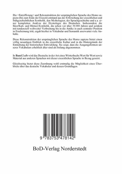 Die >Entzifferung< und Rekonstruktion der ursprünglichen Sprache des Homo sapiens (bis zum Ende der Eiszeit) entstand aus der Erforschung der eiszeitlichen und frühgeschichtlichen Symbolik, den Mythologien, der Sprachgeschichte und u.a. einer kompletten Analyse der Etymologie des Deutschen. Insbesondere die Stier/Kuh- und Hörner-Symbolik, die schon vor über 30.000 Jahren und seitdem mit tendenziell weltweiter Verbreitung bis in die Antike in auch zentraler Erscheinung tritt, ergab hierbei in Vokabular und Semantik unerwartet viele Anhalte. Diese Rekonstruktion der ursprünglichen Sprache des Homo sapiens bietet einen völlig neuartigen Einblick in die eiszeitliche Kultur und in die Hintergründe der Entstehung der historischen Entwicklung. Sie zeigt, dass die Ausgangsformen unseres Vokabulars erheblich älter sind als bislang angenommen. In Band 2 a/b wird das Deutsche in der Art eines Wörterbuchs Wort für Wort sowie Material aus anderen Sprachen mit dieser eiszeitlichen Sprache in Bezug gesetzt. Gleichzeitig bietet diese Zuordnung wohl erstmalig die Möglichkeit eines Überblicks über das deutsche Vokabular und dessen Grundlagen.