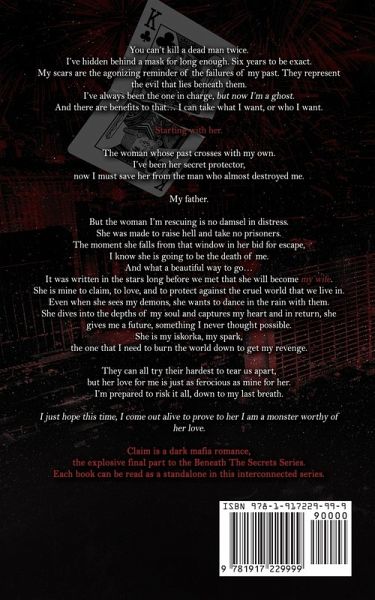 Claim is a dark mafia romance, the explosive final part to the Beneath The Secrets Series. Each book can be read as a standalone in this interconnected series. Blurb: You can't kill a dead man twice. I've hidden behind a mask for long enough. Six years to be exact. My scars are the agonizing reminder of the failures of my past. They represent the evil that lies beneath them. I've always been the one in charge, but now I'm a ghost. And there are benefits to that... I can take what I want, or who I want. Starting with her. The woman whose past crosses with my own. I've been her secret protector, now I must save her from the man who almost destroyed me. My father. But the woman I'm rescuing is no damsel in distress. She was made to raise hell and take no prisoners. The moment she falls from that window in her bid for escape, I know she is going to be the death of me. And what a beautiful way to go... It was written in the stars long before we met that she will become my wife. She is mine to claim, to love, and to protect against the cruel world that we live in. Even when she sees my demons, she wants to dance in the rain with them. She dives into the depths of my soul and captures my heart and in return, she gives me a future, something I never thought possible. She is my iskorka, my spark, the one that I need to burn the world down to get my revenge. They can all try their hardest to tear us apart, but her love for me is just as ferocious as mine for her. I'm prepared to risk it all, down to my last breath. I just hope this time, I come out alive to prove to her I am a monster worthy of her love.