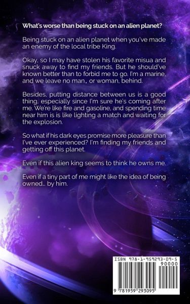 What's worse than being stuck on an alien planet? Being stuck on an alien planet when you've made an enemy of the local tribe King. Okay, so I may have stolen his favorite mishua and snuck away to find my friends. But he should've known better than to forbid me to go. I'm a marine, and we leave no man-- or woman, behind. Besides- putting distance between us is a good thing, especially since I'm sure he's coming after me. We're like fire and gasoline, and spending time near him is is like lighting a match and waiting for the explosion. So what if his dark eyes promise more pleasure than I've ever experienced? I'm finding my friends and getting off this planet. Even if this alien king seems to think he owns me. Even if a tiny part of me might like the idea of being owned... by him.