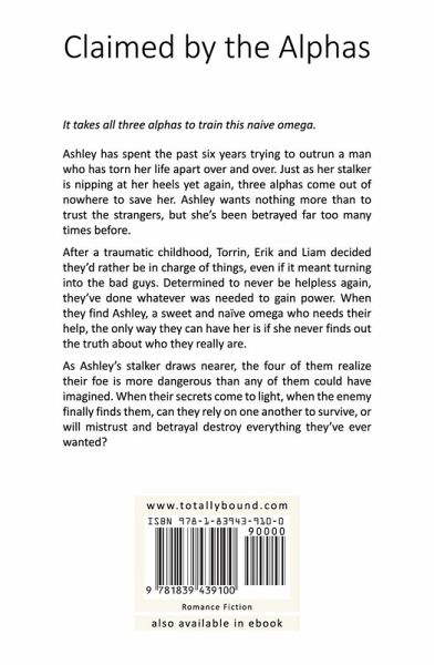 It takes all three alphas to train this naive omega. Ashley has spent the past six years trying to outrun a man who has torn her life apart over and over. Just as her stalker is nipping at her heels yet again, three alphas come out of nowhere to save her. Ashley wants nothing more than to trust the strangers, but she's been betrayed far too many times before. After a traumatic childhood, Torrin, Erik and Liam decided they'd rather be in charge of things, even if it meant turning into the bad guys. Determined to never be helpless again, they've done whatever was needed to gain power. When they find Ashley, a sweet and naïve omega who needs their help, the only way they can have her is if she never finds out the truth about who they really are. As Ashley's stalker draws nearer, the four of them realize their foe is more dangerous than any of them could have imagined. When their secrets come to light, when the enemy finally finds them, can they rely on one another to survive, or will mistrust and betrayal destroy everything they've ever wanted?