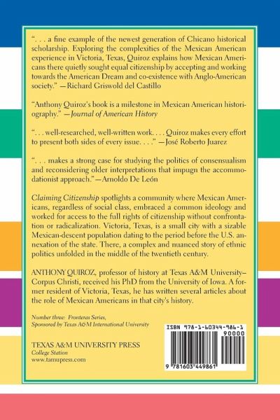 Claiming Citizenship spotlights a community where Mexican Americans, regardless of social class, embraced a common ideology and worked for access to the full rights of citizenship without confrontation or radicalization. Victoria, Texas, is a small city with a sizable Mexican-descent population dating to the period before the U.S. annexation of the state. There, a complex and nuanced story of ethnic politics unfolded in the middle of the twentieth century. Focusing on grassroots, author Anthony Quiroz shows how the experience of the Mexican American citizens of Victoria, who worked within the system, challenges common assumptions about the power of class to inform ideology and demonstrates that embracing ethnic identity does not always mean rejecting Americanism. Quiroz identifies Victoria as a community in which Mexican Americans did not engage in overt resistance, labor organization, demonstrations, or the rejection of capitalism, democracy, or Anglo culture and society. Victoria's Mexican Americans struggled for equal citizenship as the "loyal opposition," opposing exclusionary practices while embracing many of the values and practices of the dominant society. Various individuals and groups worked, beginning in the 1940s, to bring about integrated schools, better political representation, and a professional class of Mexican Americans whose respectability would help advance the cause of Mexican equality. Their quest for public legitimacy was undertaken within a framework of a bicultural identity that was adaptable to the private, Mexican world of home, church, neighborhood, and family, as well as to the public world of school, work, and politics. Coexistence with Anglo American society and sharing the American dream constituted the desired ideal. Quiroz's study makes a major contribution to our understanding of the Mexican American experience by focusing on groups who chose a more subtle, less confrontational path toward equality. Perhaps, indeed, he describes the more common experience of this ethnic population in twentieth-century America. ANTHONY QUIROZ, an assistant professor of history at Texas A&M University-Corpus Christi, received his Ph.D. from the University of Iowa. A former resident of Victoria, Texas, he has written several articles about the role of Mexican Americans in that city's history. This is his first book.