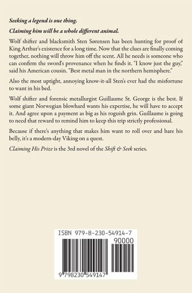 Seeking a legend is one thing. Claiming him will be a whole different animal. Wolf shifter and blacksmith Sten Sørensen has been hunting for proof of King Arthur's existence for a long time. Now that the clues finally seem to be coming together, nothing will throw him off the scent. All he needs is someone who can confirm the sword's provenance when he finds it. "I know just the guy," said his American cousin. "Best metal man in the northern hemisphere." Also the most uptight, annoying know-it-all Sten's ever had the misfortune to want in his bed. + Wolf shifter and forensic metallurgist Guillaume St. George is the best. If some giant Norwegian blowhard wants his expertise, he will have to accept it. And agree upon a payment as big as his roguish grin. Guillaume is going to need the promise of that reward to remind him to keep this trip strictly professional. Because if there's anything that makes him want to roll over and bare his belly, it's a modern-day Viking on a quest. + CLAIMING HIS PRIZE is the 3rd novel of the SHIFT & SEEK m/m shifter series. Please refer to the author's website for tropes and content notes.
