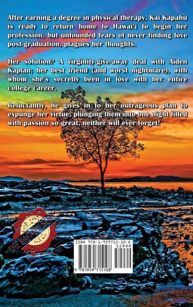 After earning a degree in physical therapy, Kai Kapahu is ready to return home to Hawai'i to begin her profession, but unfounded fears of never finding love post-graduation plague her thoughts. Her solution? A virginity-give-away deal with Aiden Kaplan, her best friend (and worst nightmare), with whom she's secretly been in love her entire college career. Reluctantly, he gives in to her outrageous plan to expunge her virtue, plunging them into one night filled with a passion so great, neither will ever forget!