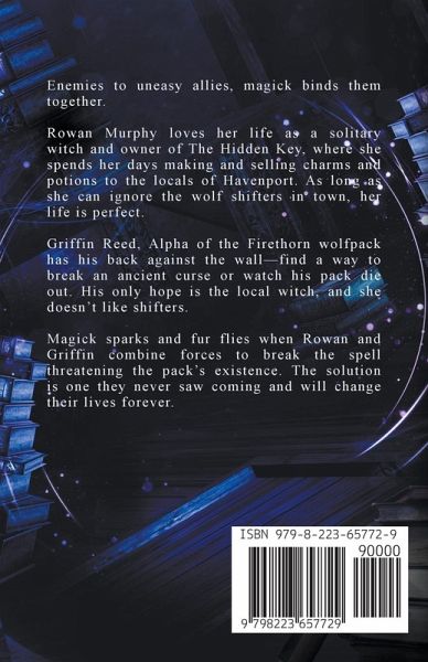 Rowan Murphy loves her life as a solitary witch and owner of The Hidden Key, where she spends her days making and selling charms and potions to the locals of Havenport. As long as she can ignore the wolf shifters in town, her life is perfect. Griffin Reed, Alpha of the Firethorn wolfpack has his back against the wall—find a way to break an ancient curse or watch his pack die out. His only hope is the local witch, and she doesn't like shifters. Magick sparks and fur flies when Rowan and Griffin combine forces to break the spell threatening the pack's existence. The solution is one they never saw coming and will change their lives forever.