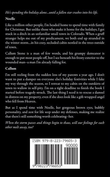 He's spending the holiday alone...until a fallen star crashes into his life. Noelle Like a million other people, I'm headed home to spend time with family for Christmas. But unlike those who make it home for the holidays, I get stuck in a ditch in an unfamiliar small town in Colorado. When a gruff stranger helps me out of my predicament, we both end up stranded in the winter storm...in his cozy, secluded cabin nestled in the trees outside of town. Callum Stone is a man of few words, and his grumpy demeanor is enough to put most people off, but I see beneath his frosty exterior to the wounded man--a man I'm already falling for. Callum I'm still reeling from the sudden loss of my parents a year ago. I don't want to put a damper on everyone else's holiday festivities while I fake my way through the season, so I retreat to my cabin on the outskirts of town to wallow in self-pity. I'm on a tight deadline to finish the book I started before tragedy struck. The last thing I need is to rescue a damsel in distress on my property, even if she does look like a gift-wrapped angel who fell from Heaven. But as I spend time with Noelle, her gorgeous brown eyes, bubbly personality, and zest for life seep under my defenses, making me realize that there's still something worth celebrating--her. When the storm passes and things begin to thaw, will our feelings for each other melt away, too? He's spending the holiday alone...until a fallen star crashes into his life. Noelle Like a million other people, I'm headed home to spend time with family for Christmas. But unlike those who make it home for the holidays, I get stuck in a ditch in an unfamiliar small town in Colorado. When a gruff stranger helps me out of my predicament, we both end up stranded in the winter storm...in his cozy, secluded cabin nestled in the trees outside of town. Callum Stone is a man of few words, and his grumpy demeanor is enough to put most people off, but I see beneath his frosty exterior to the wounded man--a man I'm already falling for. Callum I'm still reeling from the sudden loss of my parents a year ago. I don't want to put a damper on everyone else's holiday festivities while I fake my way through the season, so I retreat to my cabin on the outskirts of town to wallow in self-pity. I'm on a tight deadline to finish the book I started before tragedy struck. The last thing I need is to rescue a damsel in distress on my property, even if she does look like a gift-wrapped angel who fell from Heaven. But as I spend time with Noelle, her gorgeous brown eyes, bubbly personality, and zest for life seep under my defenses, making me realize that there's still something worth celebrating--her. When the storm passes and things begin to thaw, will our feelings for each other melt away, too?