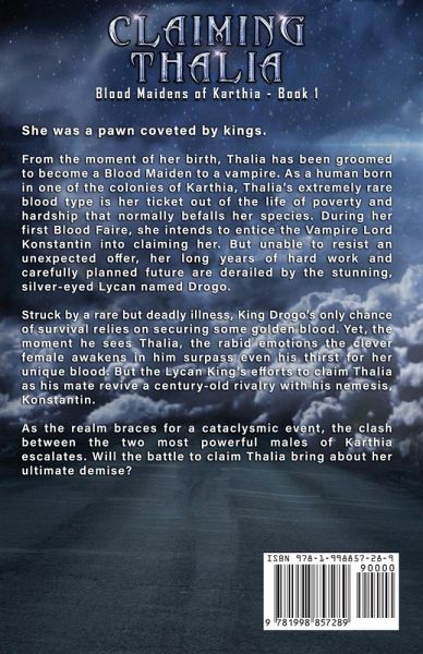 She was a pawn coveted by kings. From the moment of her birth, Thalia has been groomed to become a Blood Maiden to a vampire. As a human born in one of the colonies of Karthia, Thalia's extremely rare blood type is her ticket out of the life of poverty and hardship that normally befalls her species. During her first Blood Fair, she intends to entice the Vampire Lord Konstantin into claiming her. But unable to resist an unexpected offer, her long years of hard work and carefully planned future are derailed by a stunning, silver-eyed Lycan named Drogo. Struck by a rare but deadly illness, King Drogo's only chance of survival relies on securing some golden blood. Yet, the moment he sees Thalia, the rabid emotions the clever female awakens in him surpass even his thirst for her unique blood. But the Lycan King's efforts to claim Thalia as his mate revive a century-old rivalry with his nemesis, Konstantin. As the realm braces for a cataclysmic event, the clash between the two most powerful males of Karthia escalates. Will the battle to claim Thalia bring about her ultimate demise?