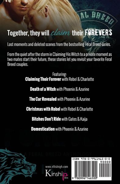 Lost moments and deleted scenes from the bestselling Feral Breed series. From the quiet after the storm in Claiming His Witch to a private moment as two mates start their future, these stories let you revisit your favorite Feral Breed couples. Together, they will claim their forevers. Featuring: Claiming Their Forever - Rebel & Charlotte November: Takes Place During Chapter #18 of Claiming His Witch Death of a Witch - Phoenix & Azurine November: Takes Place Shortly After Claiming His Witch The Car Revealed - Phoenix & Azurine December: Takes Place Shortly After Death of a Witch Christmas with Rebel - Rebel & Charlotte December: Takes Place Shortly After The Car Revealed Girls Don't Ride - Gates & Kaija January: Takes Place Between Claiming His Witch & Claiming His Beauty Domestication - Phoenix & Azurine February: Takes Place During Claiming His Beauty