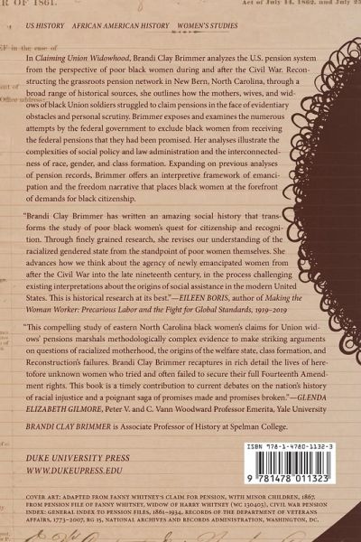 In Claiming Union Widowhood, Brandi Clay Brimmer analyzes the US pension system from the perspective of poor black women during and after the Civil War. Reconstructing the grassroots pension network in New Bern, North Carolina, through a broad range of historical sources, she outlines how the mothers, wives, and widows of black Union soldiers struggled to claim pensions in the face of evidentiary obstacles and personal scrutiny. Brimmer exposes and examines the numerous attempts by the federal government to exclude black women from receiving the federal pensions that they had been promised. Her analyses illustrate the complexities of social policy and law administration and the interconnectedness of race, gender, and class formation. Expanding on previous analyses of pension records, Brimmer offers an interpretive framework of emancipation and the freedom narrative that places black women at the forefront of demands for black citizenship.