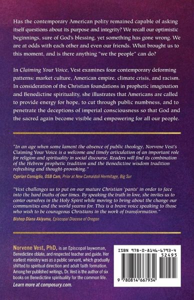 Has the contemporary American polity remained capable of asking itself questions about its purpose and integrity? We recall our optimistic beginnings, sure of God's blessing, yet something has gone wrong. We are at odds with each other and even our friends. What brought us to this moment, and is there anything "we the people" can do? In Claiming Your Voice, Vest examines four contemporary deforming patterns: market culture, American empire, climate crisis, and racism. In consideration of the Christian foundations in prophetic imagination and Benedictine spirituality, she illustrates that Americans are called to provide energy for hope, to cut through public numbness, and to penetrate the deceptions of imperial consciousness so that God and the sacred again become visible and empowering for all our people.