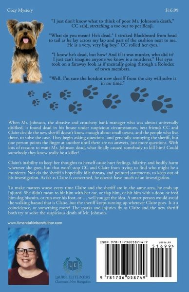 "I just don't know what to think of poor Mr. Johnson's death," CC said, stretching a toe out to pet Benji. "What do you mean? He's dead." I stroked Blackbeard from head to tail as he lay across my lap and part of the cushion next to me. He is a very, very big boy. CC rolled her eyes. "I know he's dead, but how? And if it was murder, who did it? I just can't imagine anyone we know is a murderer." Her eyes took on a faraway look as if mentally going through a Rolodex of town members. "Well, I'm sure the hotshot new sheriff from the city will solve it in no time." When Mr. Johnson, the abrasive and crotchety bank manager who was almost universally disliked, is found dead in his house under suspicious circumstances, best friends CC and Claire decide the new sheriff doesn't know enough about small towns, and the people who live there, to solve the case. They begin asking questions, and generally annoying the sheriff, but one person points the finger at another until there are no answers, just more questions. With lots of reasons to want Mr. Johnson dead, what finally caused somebody to kill him? Could somebody they know really be a killer? Claire's inability to keep her thoughts to herself cause hurt feelings, hilarity, and bodily harm wherever she goes, but that won't stop CC and Claire from trying to find who might be a murderer. Nor do the sheriff's hopefully idle threats, and pointed statements, to keep out of his investigation. As far as Claire is concerned, he doesn't have much of an investigation. To make matters worse every time Claire and the sheriff are in the same area, he ends up injured. She didn't mean to hit him with her car, or slap him, or hit him with a door, or feed him dog biscuits, or run over his foot, or ... well you get the idea. A smart person would avoid the walking hazard that is Claire, but the sheriff keeps turning up wherever Claire goes. Is it a coincidence, or something more? The sparks and injuries fly as Claire and the new sheriff both try to solve the suspicious death of Mr. Johnson.