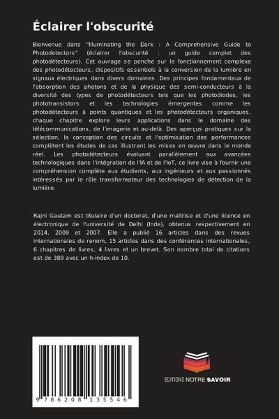Bienvenue dans "Illuminating the Dark : A Comprehensive Guide to Photodetectors" (éclairer l'obscurité : un guide complet des photodétecteurs). Cet ouvrage se penche sur le fonctionnement complexe des photodétecteurs, dispositifs essentiels à la conversion de la lumière en signaux électriques dans divers domaines. Des principes fondamentaux de l'absorption des photons et de la physique des semi-conducteurs à la diversité des types de photodétecteurs tels que les photodiodes, les phototransistors et les technologies émergentes comme les photodétecteurs à points quantiques et les photodétecteurs organiques, chaque chapitre explore leurs applications dans le domaine des télécommunications, de l'imagerie et au-delà. Des aperçus pratiques sur la sélection, la conception des circuits et l'optimisation des performances complètent les études de cas illustrant les mises en oeuvre dans le monde réel. Les photodétecteurs évoluant parallèlement aux avancées technologiques dans l'intégration de l'IA et de l'IoT, ce livre vise à fournir une compréhension complète aux étudiants, aux ingénieurs et aux passionnés intéressés par le rôle transformateur des technologies de détection de la lumière.