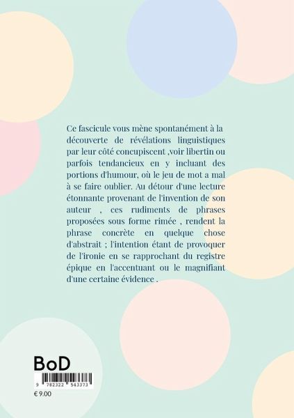 Ce fascicule vous mène spontanément à la découverte de révélations linguistiques par leur côté concupiscent ,voir libertin ou parfois tendancieux en y incluant des portions d'humour, où le jeu de mot a mal à se faire oublier. Au détour d'une lecture étonnante provenant de l'invention de son auteur , ces rudiments de phrases proposées sous forme rimée , rendent la phrase concrète en quelque chose d'abstrait ; l'intention étant de provoquer de l'ironie en se rapprochant du registre épique en l'accentuant ou le magnifiant d'une certaine évidence .
