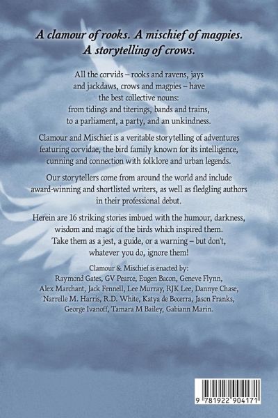 A clamour of rooks. A mischief of magpies. A storytelling of crows. All the corvids - rooks and ravens, jays and jackdaws, crows and magpies - have the best collective nouns: from tidings and titterings, bands and trains, to a parliament, a party, and an unkindness. Clamour and Mischief is a veritable storytelling of adventures featuring corvidae, the bird family known for its intelligence, cunning and connection with folklore and urban legends. Our storytellers come from around the world and include award-winning and shortlisted writers, as well as fledgling authors in their professional debut. Herein are 16 striking stories imbued with the humour, darkness, wisdom and magic of the birds which inspired them. Take them as a jest, a guide, or a warning - but don't, whatever you do, ignore them! Clamour and Mischief is enacted by: Raymond Gates, GV Pearce, Eugen Bacon, Geneve Flynn, Alex Marchant, Jack Fennell, Lee Murray, RJK Lee, Dannye Chase, Narrelle M. Harris, R.D. White, Katya de Becerra, Jason Franks, George Ivanoff, Tamara M Bailey, Gabiann Marin.