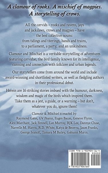 A clamour of rooks. A mischief of magpies. A storytelling of crows. All the corvids - rooks and ravens, jays and jackdaws, crows and magpies - have the best collective nouns: from tidings and titterings, bands and trains, to a parliament, a party, and an unkindness. Clamour and Mischief is a veritable storytelling of adventures featuring corvidae, the bird family known for its intelligence, cunning and connection with folklore and urban legends. Our storytellers come from around the world and include award-winning and shortlisted writers, as well as fledgling authors in their professional debut. Herein are 16 striking stories imbued with the humour, darkness, wisdom and magic of the birds which inspired them. Take them as a jest, a guide, or a warning - but don't, whatever you do, ignore them! Clamour and Mischief is enacted by: Raymond Gates, GV Pearce, Eugen Bacon, Geneve Flynn, Alex Marchant, Jack Fennell, Lee Murray, RJK Lee, Dannye Chase, Narrelle M. Harris, R.D. White, Katya de Becerra, Jason Franks, George Ivanoff, Tamara M Bailey, Gabiann Marin.