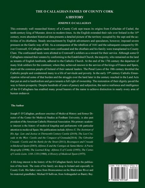 This impeccably researched and stylishly written family history traces the O Callaghans (Callaghan, Callahan) from their mythic beginnings in Ireland to their present-day progeny in County Cork, Spain, the United States, Australia, and other places. Prepared by Joseph F. O Callaghan, distinguished professor emeritus of medieval history at Fordham University, Clan Callaghan is the standard against which all future studies of this family will be measured. Adding to the volume's historical value, Professor O Callaghan has provided sixteen genealogical charts that outline numerous O Callaghan lines.