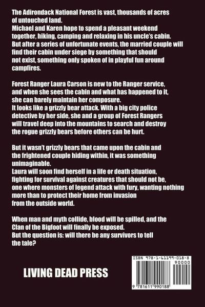 The Adirondack National Forest is vast, thousands of acres of untouched land. Michael and Karen hope to spend a pleasant weekend together, hiking, camping and relaxing in his uncle's cabin. But after a series of unfortunate events, the married couple will find their cabin under siege by something that should not exist, something only spoken of in playful fun around campfires. Forest Ranger Laura Carson is new to the Ranger service, and when she sees the cabin and what has happened to it, she can barely maintain her composure. It looks like a grizzly bear attack. With a big city police detective by her side, she and a group of Forest Rangers will travel deep into the mountains to search and destroy the rogue grizzly bears before others can be hurt. But it wasn't grizzly bears that came upon the cabin and the frightened couple hiding within, it was something unimaginable. Laura will soon find herself in a life or death situation, fighting for survival against creatures that should not be, one where monsters of legend attack with fury, wanting nothing more than to protect their home from invasion from the outside world. When man and myth collide, blood will be spilled, and the Clan of the Bigfoot will finally be exposed. But the question is: will there be any survivors to tell the tale?