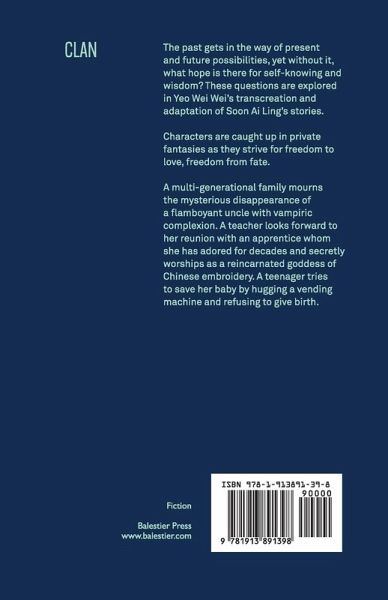The past gets in the way of present and future possibilities, yet without it, what hope is there for self-knowing and wisdom? These questions are explored in Yeo Wei Wei's transcreation and adaptation of Soon Ai Ling's stories. Characters are caught up in private fantasies as they strive for freedom to love, freedom from fate. A multi-generational family mourns the mysterious disappearance of a flamboyant uncle with vampiric complexion. A teacher looks forward to her reunion with an apprentice whom she has adored for decades and secretly worships as a reincarnated goddess of Chinese embroidery. A teenager tries to save her baby by hugging a vending machine and refusing to give birth. CONTENTS: PART 1: ADAPTATIONS Clan; The Phoenix of Big House; Table Manners; Dreaming of Madam Bai and Her Noble Peacocks PART 2: TRANCREATIONS Batik Rondo; The Talented Chef Tham; Opera; The Jade Around My Neck; Possession Soon Ai Ling is a native of Huiyang, Guangdong. She holds a bachelor's degree in Chinese Language and Literature from Nanyang University, Singapore (1971), and a PhD from the University of Hong Kong (1995). Soon is an award-winning author of several novels and anthologies. Her works have been translated into Japanese, English and Malay. She was a lecturer at the Hong Kong Institute of Education (1997-2005) and the National Institute of Education at Nanyang Technological University, Singapore (2006-2013). At present, she is a guest lecturer at the Education University of Hong Kong and NTU Singapore. Yeo Wei Wei is a writer and translator based in Singapore. Her short stories have been longlisted in the Commonwealth Short Story Prize (2021) and Glimmer Train (2013). She holds a MA in Creative Writing (Prose Fiction) from the University of East Anglia.