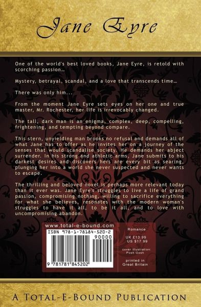 The Classics Exposed... One of the world's best loved books, Jane Eyre, is retold with scorching passion... Mystery, betrayal, scandal, and a love that transcends time... There was only him... From the moment Jane Eyre sets eyes on her one and true master, Mr. Rochester, her life is irrevocably changed. The tall, dark man is an enigma, complex, deep, compelling, frightening, and tempting beyond compare. This stern, unyielding man brooks no refusal and demands all of what Jane has to offer as he invites her on a journey of the senses that would scandalise society. He demands her abject surrender. In his strong and athletic arms, Jane submits to his darkest desires and discovers hers are every bit as searing, plunging her into a world she never suspected and never wants to escape. The thrilling and beloved novel is perhaps more relevant today than it ever was. Jane Eyre's struggles to live a life of grand passion, compromising nothing, willing to sacrifice everything for what she believes, resonates with the modern woman's struggles to have it all, to be it all, and to love with uncompromising abandon.