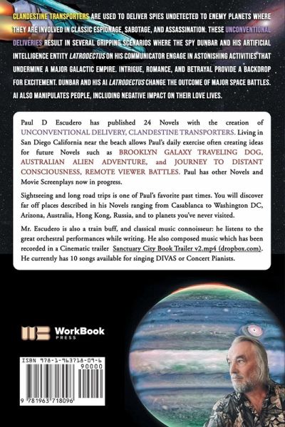 Clandestine Transporters are used to deliver spies undetected to Enemy planets where they are involved in classic espionage, sabotage, and assassination. These Unconventional Delivery result in several gripping scenarios where the Spy Dunbar and his Artificial Intelligence entity Latrodectus on his communicator engage in astonishing activities that undermine a major galactic empire. Intrigue, romance, and betrayal provide a backdrop for excitement. Dunbar and his AI Latrodectus change the outcome of major space battles. AI also manipulates people, including negative impact on their love lives.