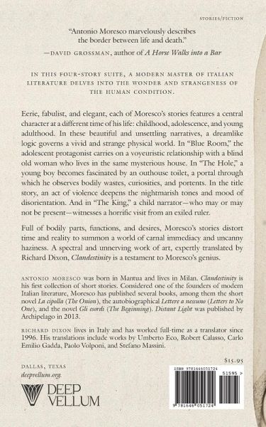 In this four-story suite, a modern master of Italian literature delves into the wonder and strangeness of the human condition. Eerie, fabulist, and elegant, each of Moresco’s stories features a central character at a different time of his life: childhood, adolescence, and young adulthood. In these beautiful and unsettling narratives, a dreamlike logic governs a vivid and strange physical world. In “Blue Room,” the adolescent protagonist carries on a voyeuristic relationship with a blind old woman in a mysterious house. In “The Hole,” a young boy becomes fascinated by an outhouse toilet, a portal through which he observes bodily wastes, curiosities, and portents. In the title story, an act of violence deepens the nightmarish tones and mood of disorientation. And in “The King,” a child narrator—who may or may not be present—witnesses a horrific visit from an exiled ruler. Full of bodily parts, functions, and desires, Moresco’s stories distort time and reality to summon a world of carnal immediacy and uncanny haziness. A spectral and unnerving work of art, expertly translated by Richard Dixon, Clandestinity is a testament to Moresco’s genius.