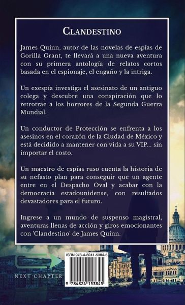 James Quinn, autor de las novelas de espías de Gorilla Grant, te llevará a una nueva aventura con su primera antología de relatos cortos basada en el espionaje, el engaño y la intriga. Un exespía investiga el asesinato de un antiguo colega y descubre una conspiración que lo retrotrae a los horrores de la Segunda Guerra Mundial. Un conductor de Protección se enfrenta a los asesinos en el corazón de la Ciudad de México y está decidido a mantener con vida a su VIP... sin importar el costo. Un maestro de espías ruso cuenta la historia de su nefasto plan para conseguir que un agente entre en el Despacho Oval y acabar con la democracia estadounidense, con resultados devastadores para el futuro. Ingrese a un mundo de suspenso magistral, aventuras llenas de acción y giros emocionantes con 'Clandestino' de James Quinn.