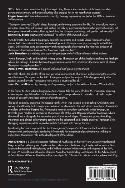 'Clara Thompson was not only one of the most important leaders in the psychoanalysis of her time, but also one of the singular figures in the entire history of the discipline. She was a pioneer in so many ways, founding and then directing one of the most significant psychoanalytic institutes, bringing together the work of Erich Fromm and Harry Stack Sullivan to create interpersonal psychoanalysis, and creating one of the first bodies of work devoted to the psychology of women. She was one of those who created the study of gender and sexuality. She was a powerfully inspiring leader at a time when that was highly unusual for a woman in psychiatry or psychoanalysis. Thompson richly deserves Ann D'Ercole's deep, thorough, and moving account of her life. This two-volume work is absolutely riveting, an instant classic that will be read and studied not only by psychoanalysts and other psychotherapists, but by anyone interested in cultural history, feminism, the history of psychiatry, and gender and sexuality.'