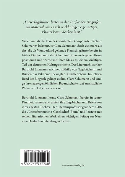 "Diese Tagebücher bieten in der Tat für den Biografen ein Material, wie es sich reichhaltiger, eigenartiger, schöner kaum denken lässt." Vielen nur als die Frau des berühmten Komponisten Robert Schumanns bekannt, ist Clara Schumann doch viel mehr als das: die als Wunderkind geltende Pianistin glänzte bereits in früher Kindheit mit zahlreichen Auftritten und eigenen Kompositionen und wurde mit ihrer Musik zu einem wichtigen Teil der deutschen Kulturgeschichte. Der Literaturhistoriker Berthold Litzmann zeichnet mithilfe von Tagebüchern und Briefen das Bild eines bewegten Künstlerlebens. Im letzten Band der Biografie gelingt es ihm, Clara Schumann und einige ihrer außergewöhnlichen Freundschaften auf anschauliche Weise zum Leben zu erwecken. Berthold Litzmann lernte Clara Schumann bereits in seiner Kindheit kennen und erhielt ihre Tagebücher und Briefe von ihrer ältesten Tochter. Der Literaturprofessor gründete 1906 die "Literarhistorische Gesellschaft Bonn" und leistete mit seinem literarischen Werk einen wichtigen Beitrag zur Neueren Deutschen Literaturgeschichte.