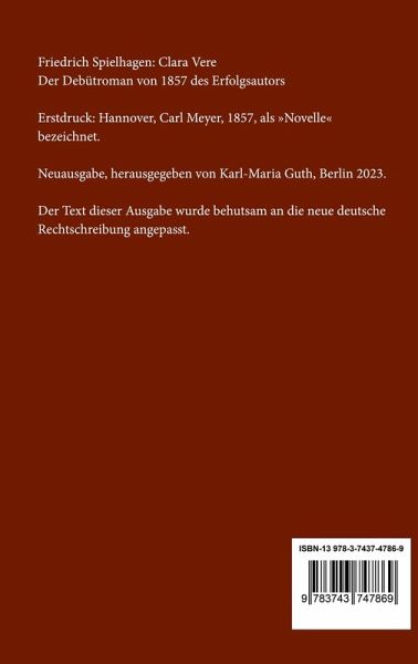 Friedrich Spielhagen: Clara Vere. Der Debütroman von 1857 des ErfolgsautorsErstdruck: Hannover, Carl Meyer, 1857, als »Novelle« bezeichnet.Neuausgabe, herausgegeben von Karl-Maria Guth, Berlin 2024.Der Text dieser Ausgabe wurde behutsam an die neue deutsche Rechtschreibung angepasst.Umschlagabbildung: Max Slevogt, Dame in weißem Kleid auf einem Pferd, 1910Gesetzt aus der Minion Pro, 11 pt.Henricus - Edition Deutsche Klassik GmbH