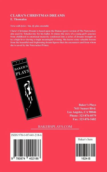 Verse with lyrics / 4m, 4f. Plus Ensemble. Newly Revised! Based on the Dumas(pere) version used by Tchaikovsky in his ballet The Nutcracker. The well-loved story of a young girl from childhood to emotional maturity condensed into a single evenings' series of dreams brought forth by a fever. She learns some valuable lessons from the beautiful to the frightening apparitions she encounters until she is saved by a Nutcracker/Prince.