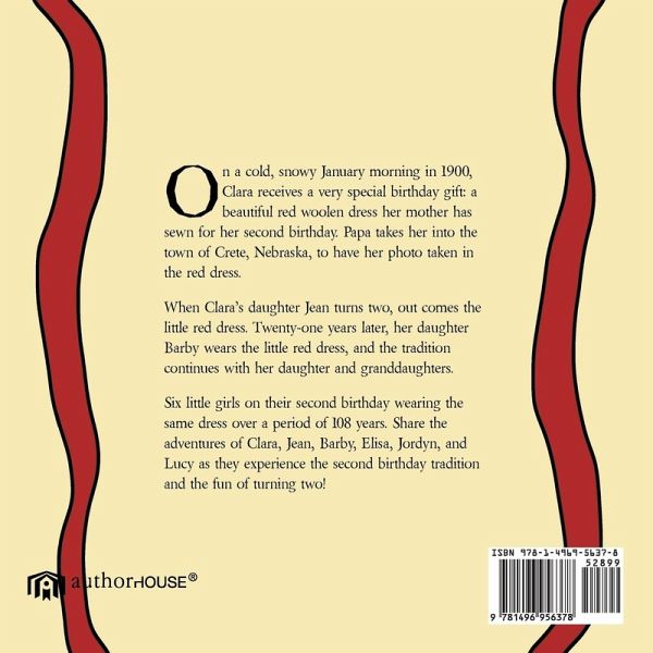 On a cold, snowy January morning in 1900, Clara receives a very special birthday gift: a beautiful red woolen dress her mother has sewn for her second birthday. Papa takes her into the town of Crete, Nebraska, to have her photo taken in the red dress. When Clara's daughter Jean turns two, out comes the little red dress. Twenty-one years later, her daughter Barby wears the little red dress, and the tradition continues with her daughter and granddaughters. Six little girls on their second birthday wearing the same dress over a period of 108 years. Share the adventures of Clara, Jean, Barby, Elisa, Jordyn, and Lucy as they experience the second birthday tradition and the fun of turning two!