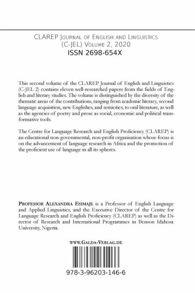 This second volume of the CLAREP Journal of English and Linguistics (C-JEL 2) contains eleven well-researched papers from the fields of English and literary studies. The volume is distinguished by the diversity of the thematic areas of the contributions, ranging from academic literacy, second language acquisition, new Englishes, and semiotics, to oral literature, as well as the agencies of poetry and prose as social, economic and political transformative tools. The Centre for Language Research and English Proficiency (CLAREP) is an educational non-governmental, non-profit organisation whose focus is on the advancement of language research in Africa and the promotion of the proficient use of language in all its spheres.